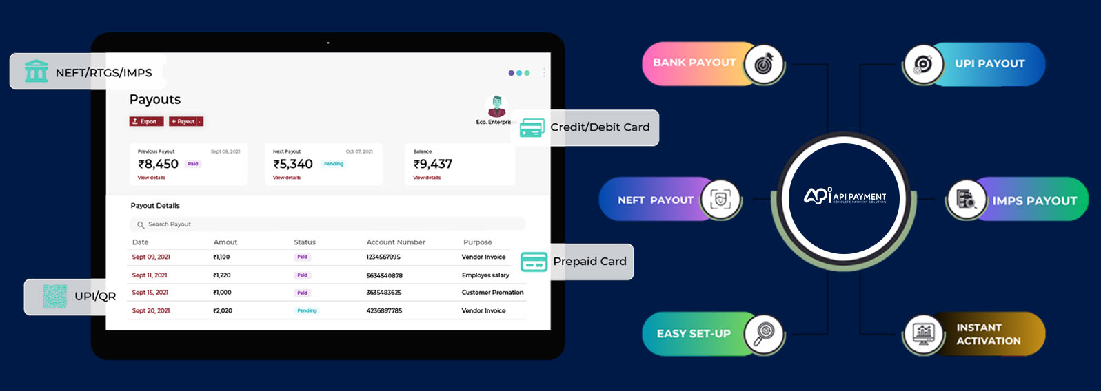 A powerful enterprise-grade Payouts API that enables businesses to send money instantly through UPI, IMPS, NEFT, RTGS and wallet-based payouts. Ideal for refunds, vendor payments, salaries, incentives & bulk disbursement needs.